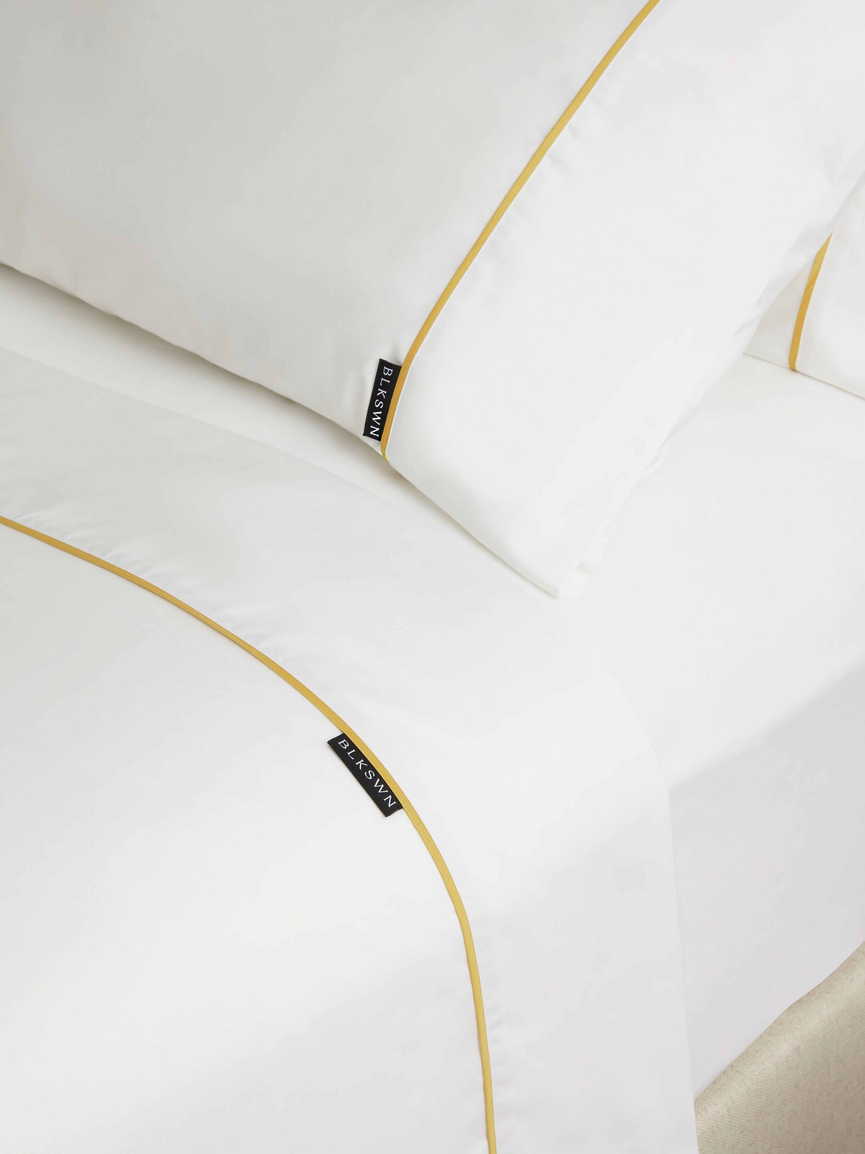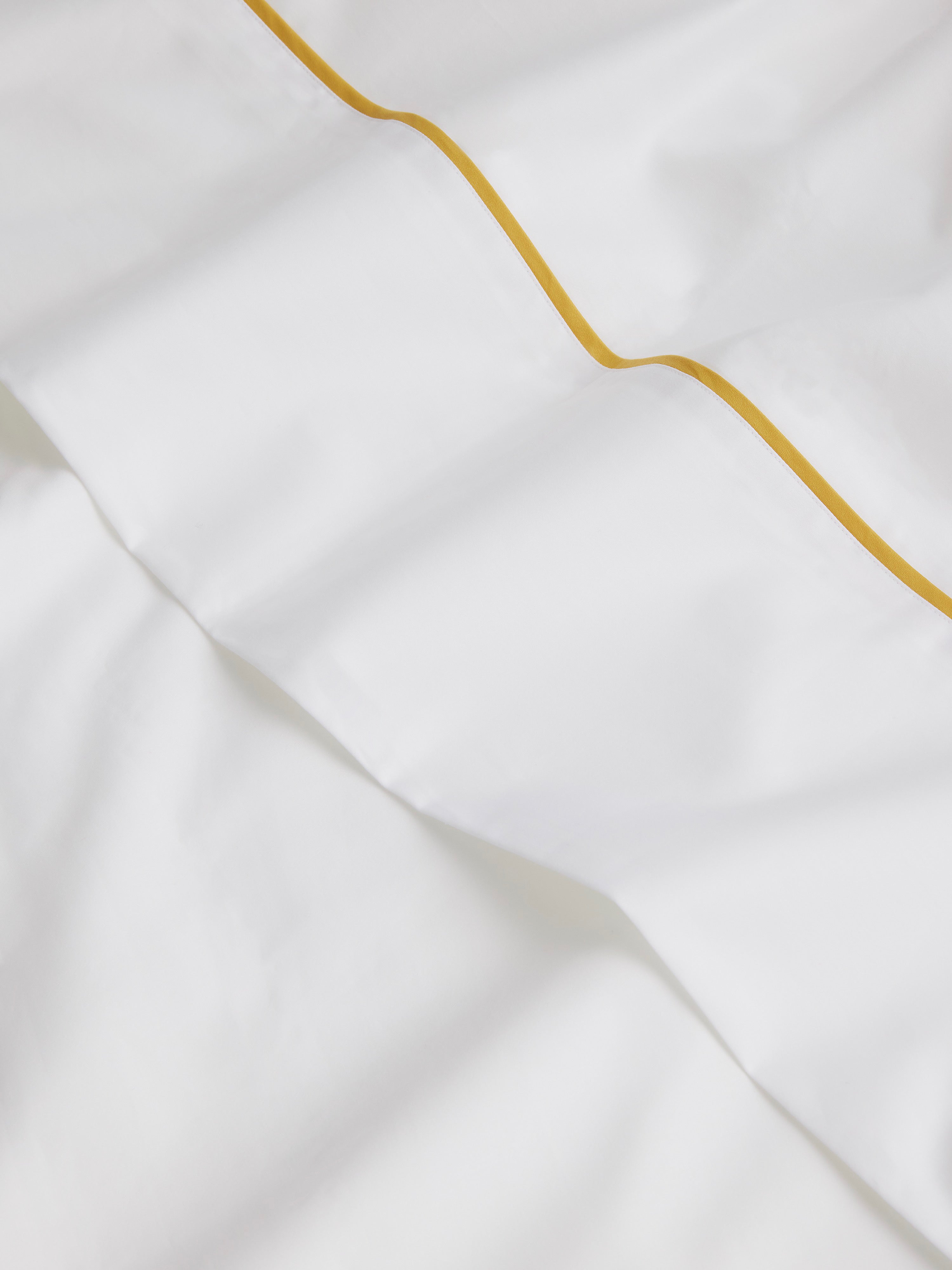 As the name suggests, this classic sheet set with two pillowcases, a fitted and flat sheet pairs effortlessly with your favorite duvet cover. The perfect gold piping gently highlights the golden hues of it’s matching bed linen. 100% cotton sateen, slipping into these sheets feels like dipping into a warm bathtub full of fragrant bubbles.